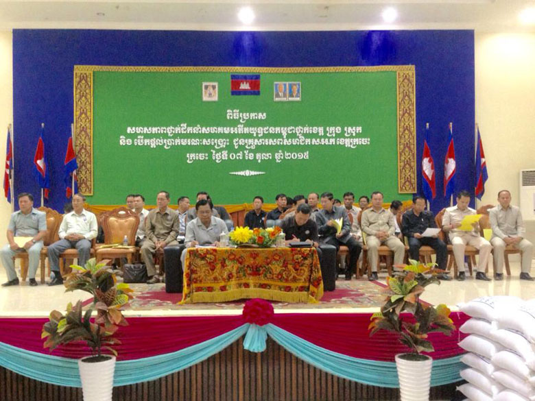 ក្រចេះ, ព្រឹកថ្ងៃទី ០៧-១០-២០១៥ មានកម្មវិធីប្រកាសសមាសភាពថ្នាក់ដឹកនាំសមាគមអតីតយុទ្ធជនថ្នាក់ខេត្ត-ក្រុង-ស្រុក និងបើកផ្តល់ប្រាក់មរណ:សង្គ្រោះ ជូនគ្រួសារសពសមាជិក ស អ ក ខេត្តក្រចេះ នៅសាលមហោស្រពខេត្ត ក្រោមអធិបតីភាពដ៏ខ្ពង់ខ្ពស់ឯកឧត្តម ហ៊ុន ម៉ាណែត អគ្គលេខាធិការង សមាគម ស អ ក និង ឯកឧត្តម សរ ចំរុង គណ:អភិបាលខេត្តក្រចេះ ដោយមានការចូលរួមពីឯកឧត្តម លោកជំទាវ អស់លោក លោកស្រី ថ្នាក់ដឹកនាំជុំវិញខេត្តទាំងអស់-ថ្នាក់ក្រសួង និងគ្រួសារអតីត
